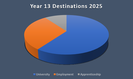 We are immensely proud of our Year 13 students who have shown resilience and determination in their exams this year to help them in to their next step in education. We are also delighted to announce that 100% of our students are at university (60%), undertaking an apprenticeship (10%) or are in employment (30%). Our careers provision and guidance (supported with our Unifrog platform and Services for Young People) has enabled our students to make the appropriate choices in their next steps and we are proud to announce that we are Gatsby benchmark compliant, achieving 100% in every category for the second year running.