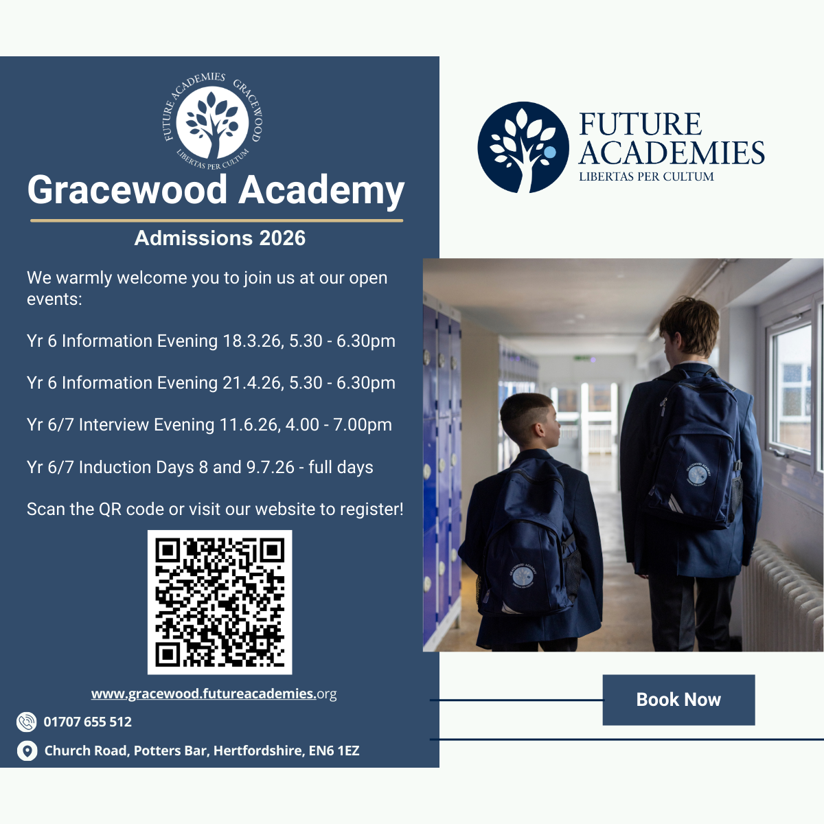 Have you received a place at Gracewood for September? Mrs Pointon will have already been in touch about coffee mornings and tours, but please ensure you book onto one of the information evenings and the other events by scanning the QR code and clicking on the booking links!